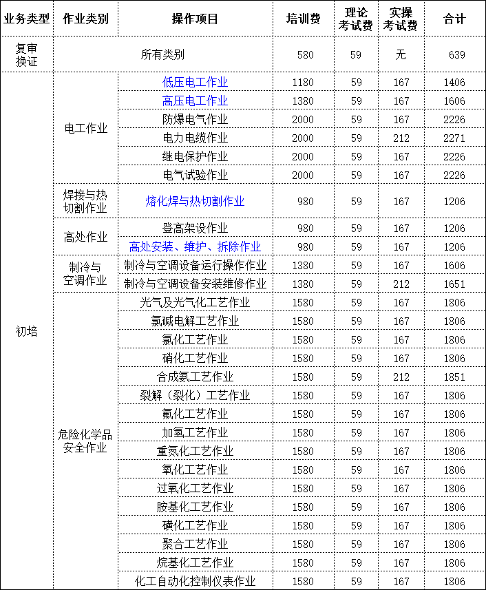 初培:培训费980元起,考试费226元,不同工种费用会有差异;复审:培训费580元,考试费59元。