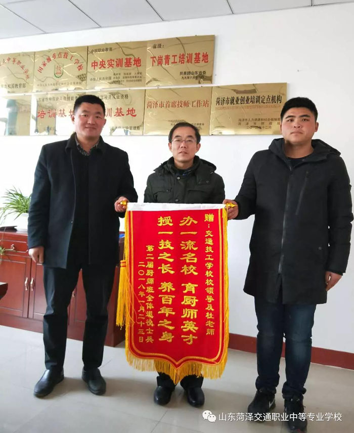 今天下午,参加菏泽市交通高级技工学校烹饪班培训的退伍士兵们学期已满,即将离开学校,书记张恩艳、安全培训处处长郭实英及烹饪班老师杜守亮与他们在学校二楼会议室举行了送别仪式。仪式上,培训班班长代表退伍士兵们向学校赠送了锦旗,感谢学校的给予的免费学习机会,让他们在这里不仅学到技术也经历了一段特别的生活。 张书记说,他们让我们看到了真真正正的军人风采,学习中,始终对自己高标准、严要求。大家在学习的这段时间里,不仅是教授技术和学习技术的过程,更像是一家人在一起温馨的相处,今天的分别虽有诸多不舍,但想到大家毕业后都能靠学到的技术给自己的人生增添光增彩又感到无比的高兴。