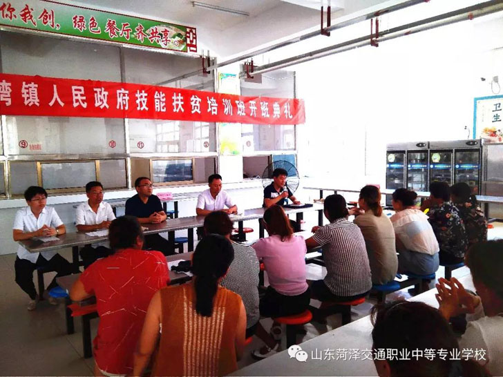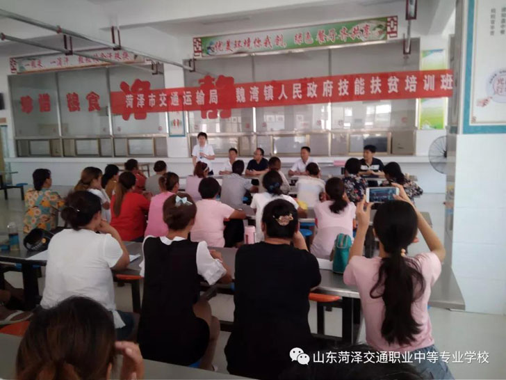 7月19日上午,菏泽市交通高级技工学校联合市交通运输局、人社局、曹县魏湾镇人民政府举办的扶贫培训班在曹县魏湾镇中学举行开班仪式。市交通局驻魏湾镇第一书记赵梓松、魏湾镇镇长王爱华、交通集团总公司经贸处处长郭虎恩、菏泽市交通高级技工学校校长张红雪、安全培训处主任郭实英出席会议。参加本期扶贫的全体学员们按时到达现场。本次扶贫培训班培训学校为菏泽市交通高级技工学校,主要培训项目为面点技术,全程免费为学员上课并提供必备学习用品。开幕仪式由我校校长张红雪主持,赵科长、王镇长分别讲话,郭主任传达上课相关事宜。 仪式上,首先,由魏湾镇王镇长致辞;其次,交通局赵科长讲话,宣传国家扶贫好政策,讲述组织培训班的目的,希望大家珍惜机会,学到本领并能增加收入,提高生活水平;再次,学校安全培训处郭主任讲述培训事宜及相关注意事项;最后,张校长总结讲话,再次感谢领导们的莅临指导,学校会尽心尽力,希望能够帮到更多需要帮助的人,并提醒学员在来上课的路上注意安全。 菏泽市交通高级技工学校校长张红雪主持会议 魏湾镇镇长王爱华致辞 市交通局运管处副处长驻魏湾镇第一书记赵梓淞讲话 学校安全培训处郭主任安排上课注意事项 受人以鱼不若授人以渔!菏泽交通高级技工学校以技术下乡,愿意为父老乡亲脱贫致富助一臂之力!各位第一书记如果有意向,我们可以联手,您出地方,我出技术,一起把国家的扶贫工作做好!