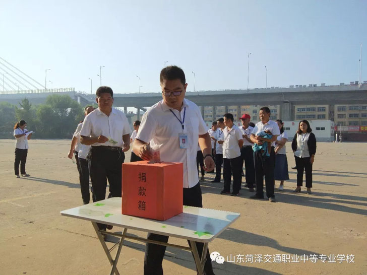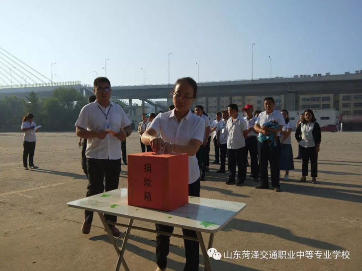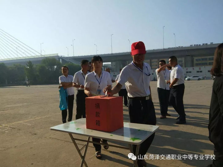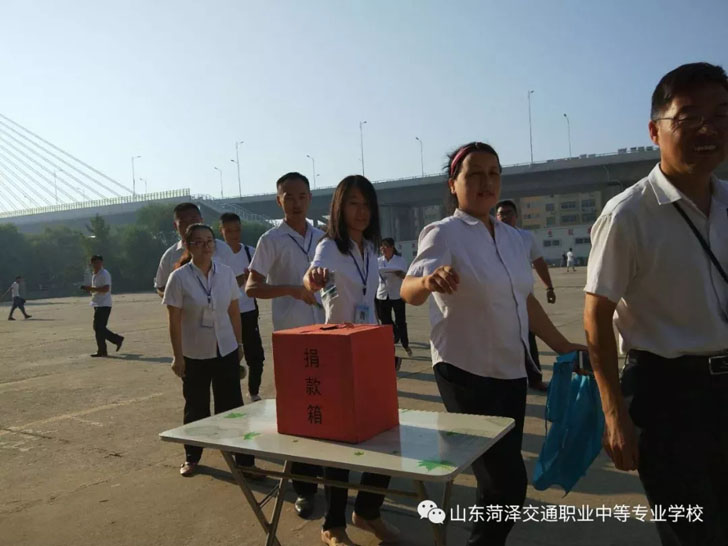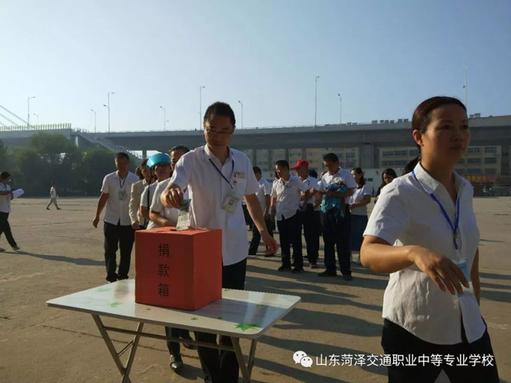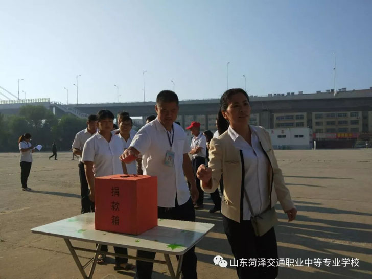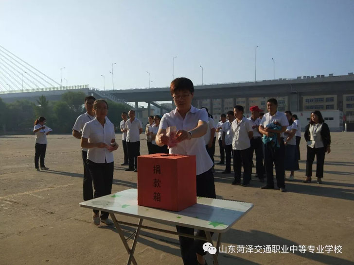 菏泽市交通高级技工学校积极响应市人民政府、交通集团总公司关于开展”情系灾区“募捐活动的号召,并于9月11日上午8点,校委会领导带领全体教职工在办公楼前开展“情系灾区”募捐活动。