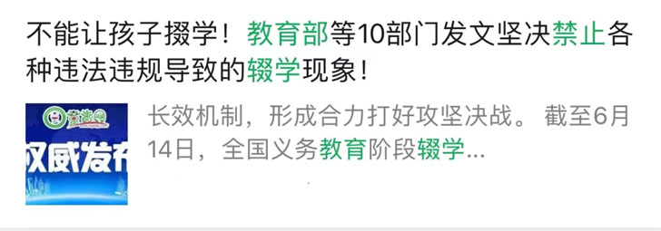 家长要坚定信念:不能让孩子过早进入社会必须完成学业! 做正确的选择:高中阶段教育和中等职业教育是初中毕业生的最好选择,这意味着将来的同龄人,有90%以上的都至少有高中文化程度,只有10%以下的人仅仅初中毕业,只有初中文化的人将来不适应社会的发展。十五六岁的孩子刚刚离开初中学校,思想很单纯,理想化严重,加上“三观”尚未成熟,容易受他人影响,所以不要轻易让初中孩子过早进入社会。 教育部等十部门发文坚决禁止各种辍学现象的发生。