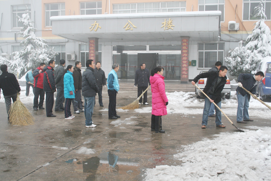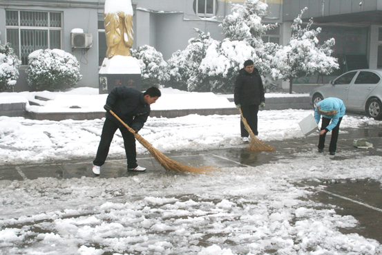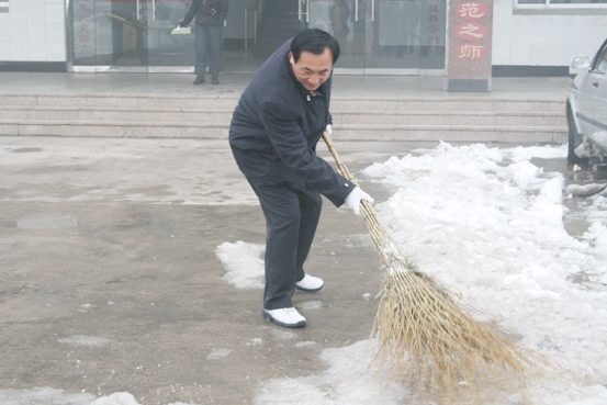 “雪情就是命令”。校长、书记亲自上阵,职工也自发的顶着寒风,不畏严寒,挥舞着铁锹、扫帚清除学校院内的积雪。在领导的影响和带动下,全体人员充分发挥了团结协作、奋力拼搏、敬业奉献的精神,大家一锹一锹地铲除校院内厚厚的积雪。同志们齐心协力,在校院内把积雪堆积起一座高高的雪堆,虽然天气寒冷,但整个劳动现场热火朝天,经过近三个多小时的清扫,终于把校院内和大门口的雪清扫的干干净净,确保了学校院内道路的畅通。